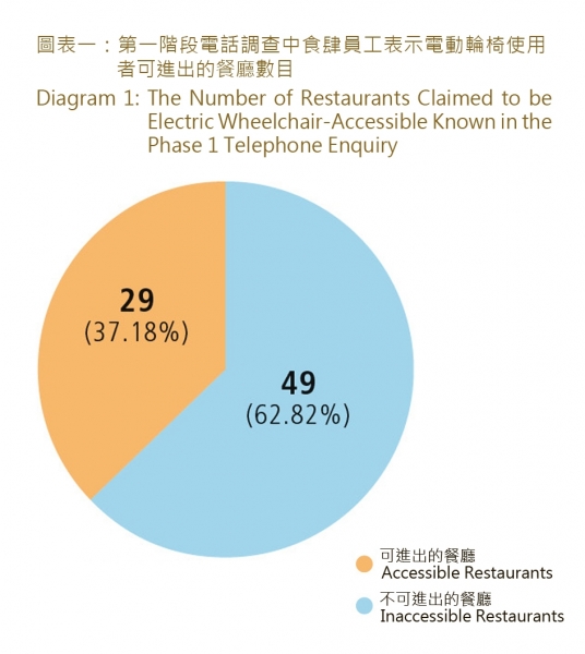 本會於第一階段成功用電話致電至米芝蓮指南中收錄的78間餐廳(包括評審員推介及指南內收錄消費在100元以下),查詢有關食肆是否可以讓輪椅使用者進出。當中有29間餐廳表示電動輪椅使用者可進內用膳,佔總餐廳數目的37.18%。1