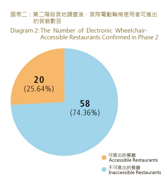 調查員在第二階段,到上述29間餐廳員工表示電動輪椅使用者可進內用膳的餐廳作實地調查,發現實際只有20間餐廳是電動輪椅使用者可以進出,佔總餐廳數目的25. 64%。2
