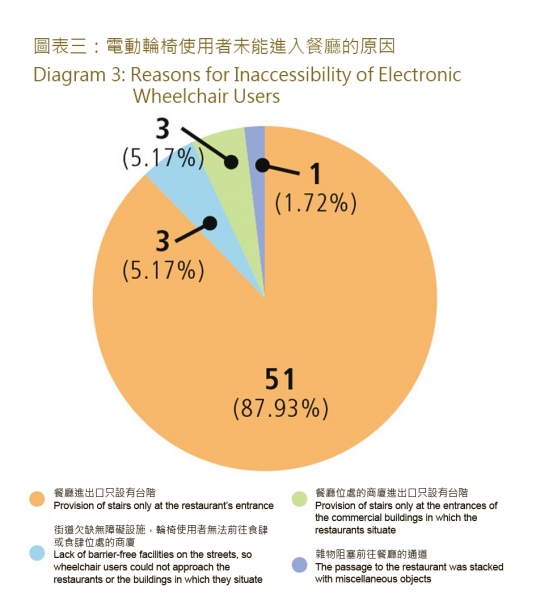 調查結果顯示, 在5 8 間電動輪椅無法進內用膳的餐廳中, 有5 1 間(87.93%)餐廳是因為其進出口只設有台階。另外,有3間(5.17%)餐廳位處的商廈進出口只設有台階,同樣令電動輪椅使用者無法進內用膳;有3間(5.17%)餐廳因為街道欠缺無障礙設施,使輪椅使用者無法接近有關餐廳及餐廳所處的商廈,而有1間(1.72%)餐廳原先有通道可供輪椅使用者進內,惟有關通道放置了雜物,輪椅使用者最終亦無法進內用膳。
