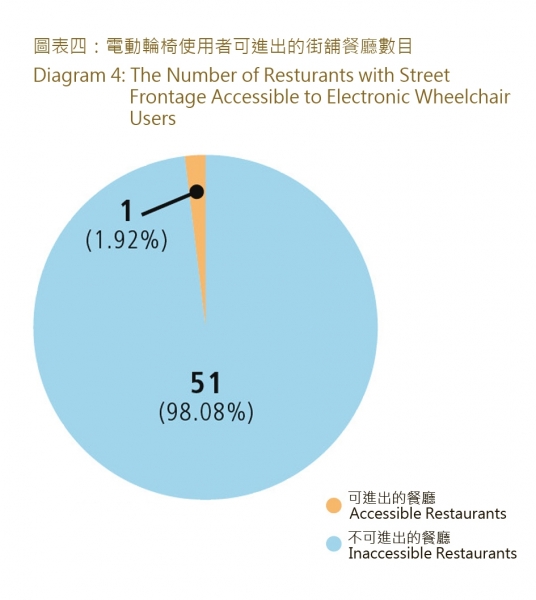 調查發現在52間位於街舖的食肆當中,只有1間(1.92%)是電動輪椅使用者可以進內用膳;而位於商廈的餐廳情況則較為理想,在26間位於商廈的餐廳當中,有19間(73.08%)餐廳可讓電動輪椅使用者進內用膳。