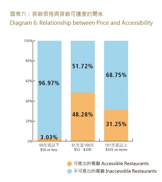 調結果顯示,在33間3消費在50元或以下的餐廳之中,只有1間(3.03%)餐廳可供電動輪椅使用者進內用膳,而29間消費介乎51元至100元的餐廳之中,則有14間(48.28%)餐廳是電動輪椅使用者可以進出。在16間消費在101元或以上的餐廳之中,只有5間(31.25%)是電動輪椅使用者可進內用膳。結果發現,消費達50元或以上的餐廳,才較方便電動輪椅使用者進內用膳。